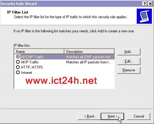 10.Trong IP Filter List window chọn "All ICMP Traffic" (hoặc bất cứ IP Filter nào đã config ở bước #5). Vì một lý do nào đó, nếu bạn đã chưa config IP Filter trước đó, giờ đây có thể nhấn Add và bắt đầu khởi tạo. Khi đã thực hiện, click Next.